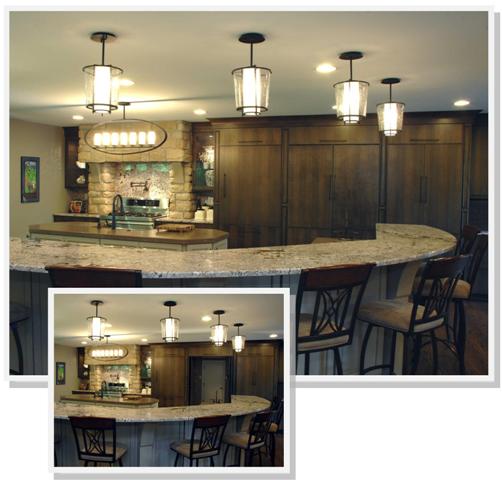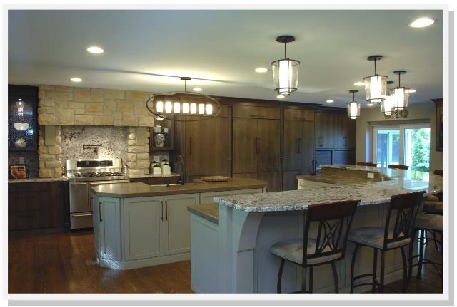 This recently completed kitchen is a testament to the design talent of owner Mike Beck and his ability to select the perfect combination of door style, wood species and finish for a truly unique result. Mike’s design married the sophistication of the Crystal Redondo door style with natural elements throughout the space. The flat, slab door showcases the distinctive characteristics found in the quarter-sawn oak, and the Blackstone finish adds a hint of contemporary flair. Large natural stones surround the range and granite countertops adorn the perimeter cabinetry. For the islands, Shiloh cabinets in Taupe were finished with a Mocha Glaze and paired with both concrete and granite countertops.