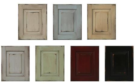 Olde World Finishes from left to right: Custard, Colonial Blue, Corn Silk, Heritage Gray, Jade Green, Cordovan and Ebony.