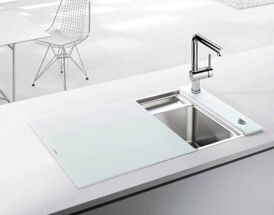 Also from Blanco, taking inspiration from European kitchens, the Crystalline™ sink, also known as the “vanishing sink,” is the perfect solution for smaller kitchens, wet bars and butler’s pantries. The Cyrstalline™ features MicroEdge™ technology in a compact size with clean lines. The safety glass cover fits on top of the sink to create more workspace – or to hide dirty dishes and a small upper tray is perfect for storing your sponge or rinsing cooking utensils. Not for use with garbage disposal.
