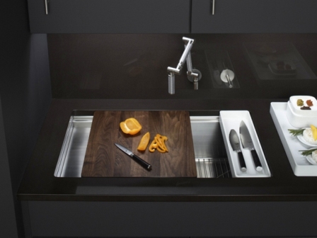 The Stages™ collection from Kohler was designed in collaboration with the chefs at Kohler’s Five Diamond resort hotel. Integrated accessories like stackable bowls, a cutting board and drain board allow homeowners to personalize the sink to meet their needs. The design offers a wide basin to accommodate large pots and pans, as well as a stepped side platform for prepping food or drying dishes.